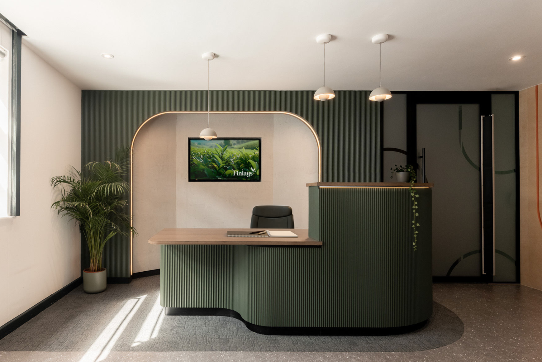 Design FYI was appointed by Finlays Beverages to redesign their reception. Working within tight spatial constraints and an existing fixed wall that could not be altered, the design focused on efficiency without compromising the overall experience. The result is a space that feels open, considered and cohesive, despite its limited size.