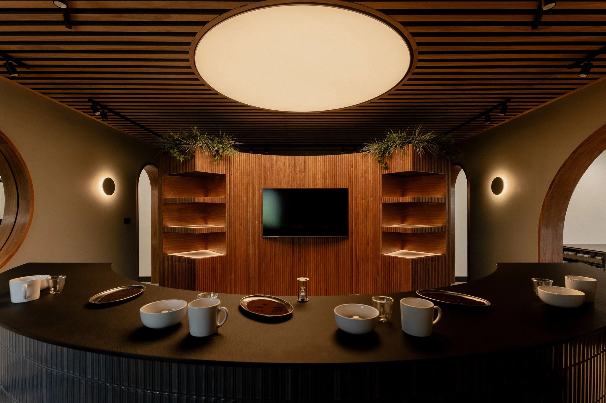 A defining feature of the project is the use of circular openings to connect the different areas. Inspired by traditional Japanese architecture and the cultural significance of tea as a ritual, these forms introduce a softer, more human layer to the space.