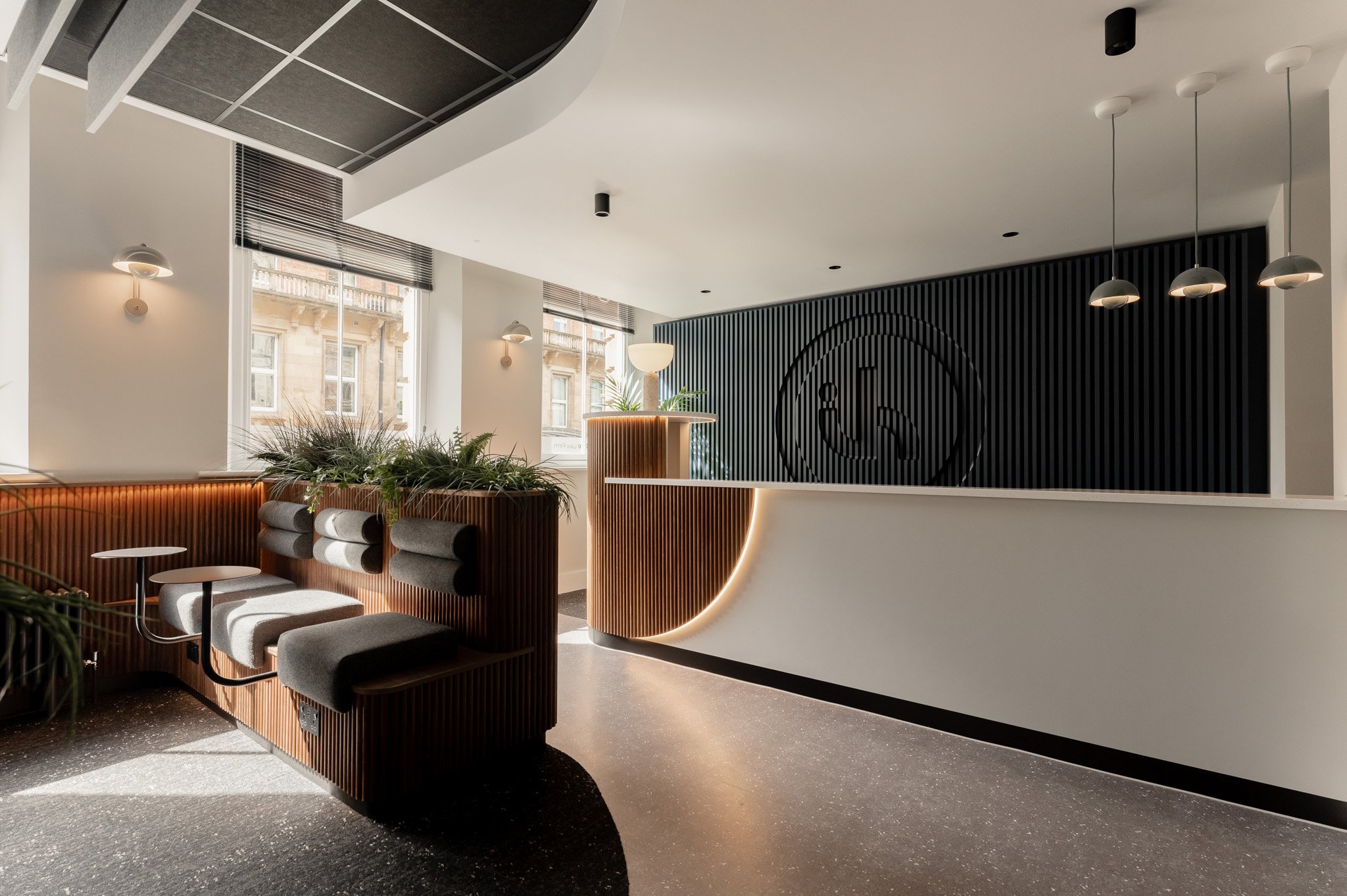 The reception area was designed to feel open yet intentional, with a clear separation between arrival and waiting zones. The waiting area has been carefully considered as an extension of the overall experience rather than an afterthought. Three distinct seating zones have been created, combining sofas, tables and integrated bench seating to accommodate different needs. Upholstered elements, feature planters and acoustic treatments work together to soften the environment, improving both comfort and sound quality while clients wait.