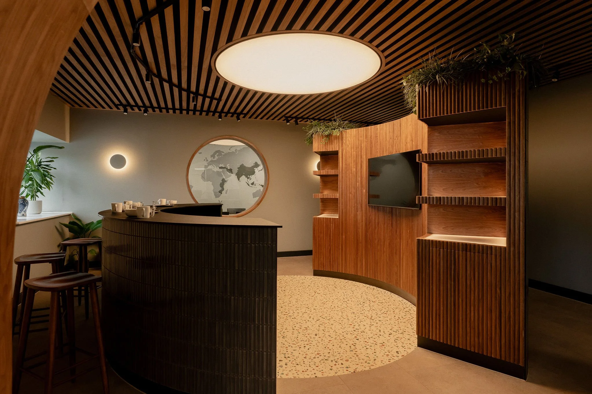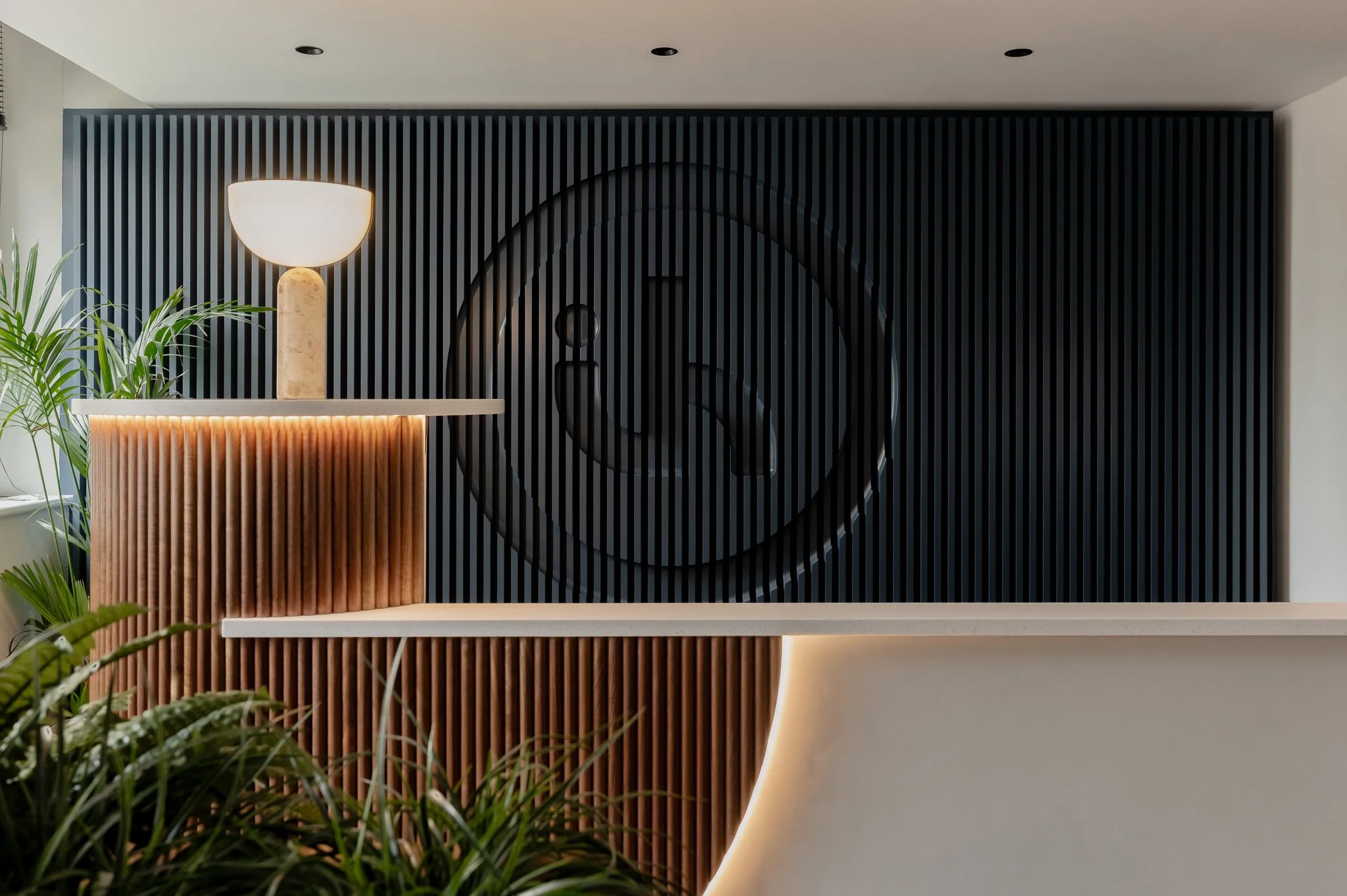 • Some things simply can't be bought off a shelf ..and shouldn't be. We work with trusted craftspeople to design and make bespoke joinery that becomes the heart of a space: curved reception desks, feature walls with routed detail, slatted ceiling installations, built-in seating with integrated planting, and architectural arches that frame how people move through a room. Every piece is designed as part of the whole, not added afterwards.
